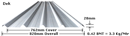 Modern looking product suitable for roofing and walling applications. The sheet's deep ribs allows for a 2 degree minimum roof pitch giving Dek Roofing excellent water carrying capabilities.