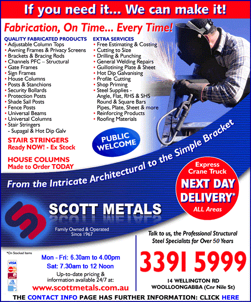 Brisbane's leading Steel Fabrication and Welding Company is based in Woolloongabba. Quality Products and Workmanship, On Time, Every Time - Expect no less. When you require reliability and great service on your fabricated steel merchandise look no further than Scott Metals Welding and Fabrication Services. Family owned and operated since 1967, the specialists in structural steel for the domestic building market, Scott Metals is trusted by Brisbane's leading building companies, for the supply and fabrication of everything from the most intricate architectural steelwork to the simplest bracket. Large or small, quality fabricated steel products for the Tradesman, Owner Builder and Home Handyman.