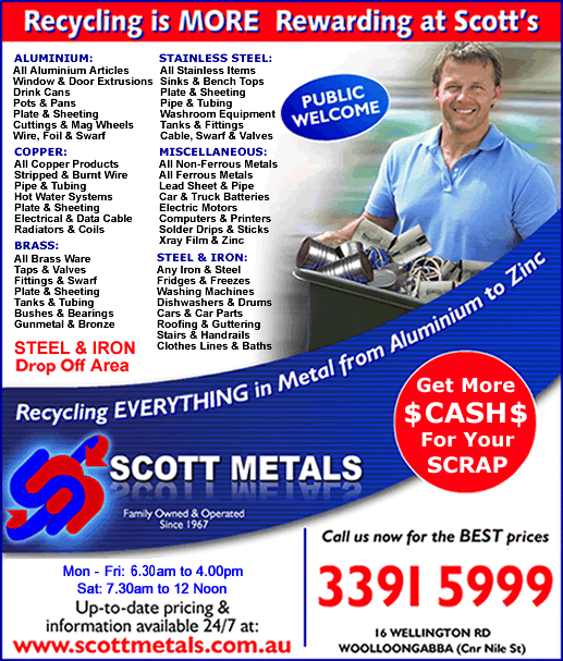 In addition to the Steel Fabrication and Supply Company, the Scott brothers also own and operate a metal recycling business. This enterprise, Scott Metals Recycling Services, recycles all forms of metal from Aluminium to Zinc and is situated in the heart of Brisbane at 16 Wellington Road, Woolloongabba.