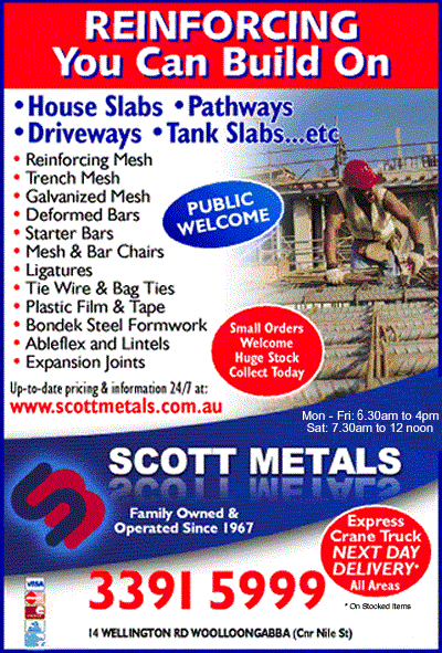 Reinforcing Mesh, Galvanised Mesh, Handyman Mesh, Trench Mesh, Reinforcing Bar, Deformed Bar, Bar Chairs, Starter Bars, Ligatures, Building Film, Bondek, Mesh Accessories and associated steel products for concrete reinforcing are all available from our Brisbane store in Woolloongabba.